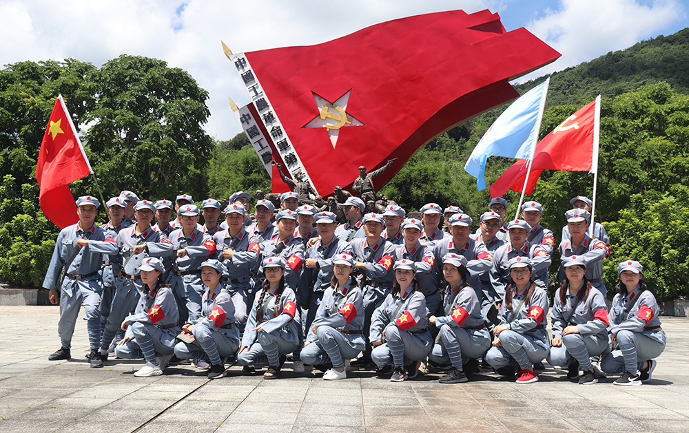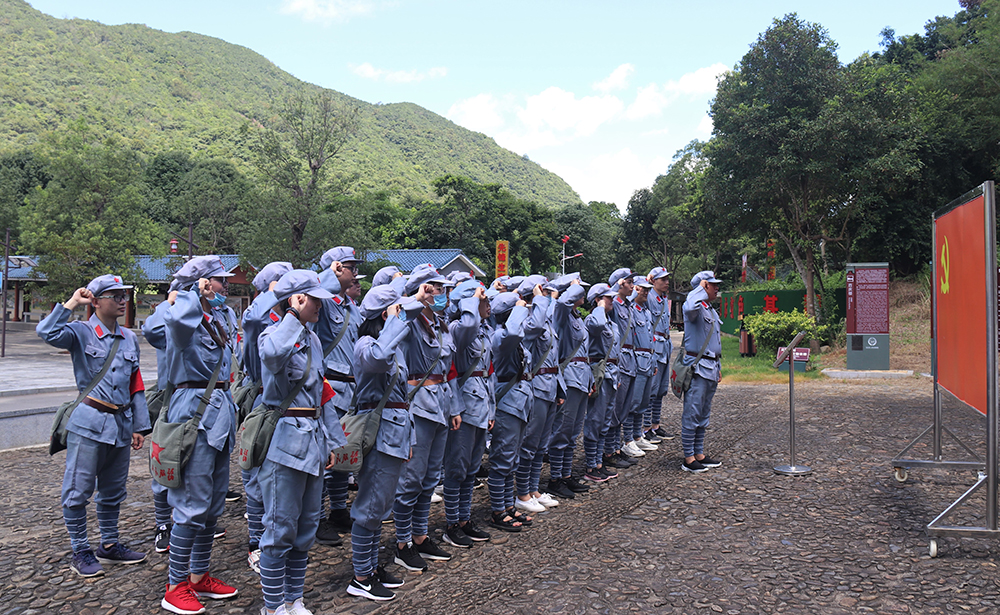 經過3個小時的車程,黨員們到達了有著“東江紅都”之稱的高潭鎮。炙熱的陽光助漲了大家的熱情,換上統一紅軍裝后,在組織委員張斌的帶領下,大家隊列整齊,唱著激昂的歌曲,喊著響亮的口號,踏著堅定的步伐走過馬克思街和列寧街,馬克思街和列寧街是中國最早以共產主義領導人名命名的街道,是極具歷史意義“紅色印記”。緊接著,大家來到烈士紀念碑前,在莊嚴肅靜的氛圍中,聽從教官統一指揮,向烈士敬獻花籃、默哀悼念、撫今追昔、緬懷先烈。