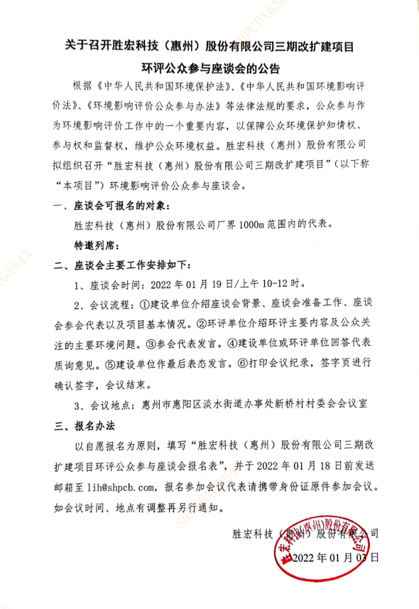 關(guān)于召開勝宏科技(惠州)股份有限公司三期改擴(kuò)建項(xiàng)目環(huán)評(píng)公眾參與座談會(huì)的公告